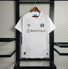A camisa reserva do Grêmio para a temporada 23/24 é predominantemente branca e conta com faixas azuis e havana nas laterais, uma referência ao primeiro fardamento da história do Grêmio Foot-Ball Porto Alegrense, que era listrado nas duas cores, na horizontal. Grafismos que remetem aos diamantes símbolo da Umbro foram adicionados às mangas, em jacquard. A gola V é branca, assim como os punhos.